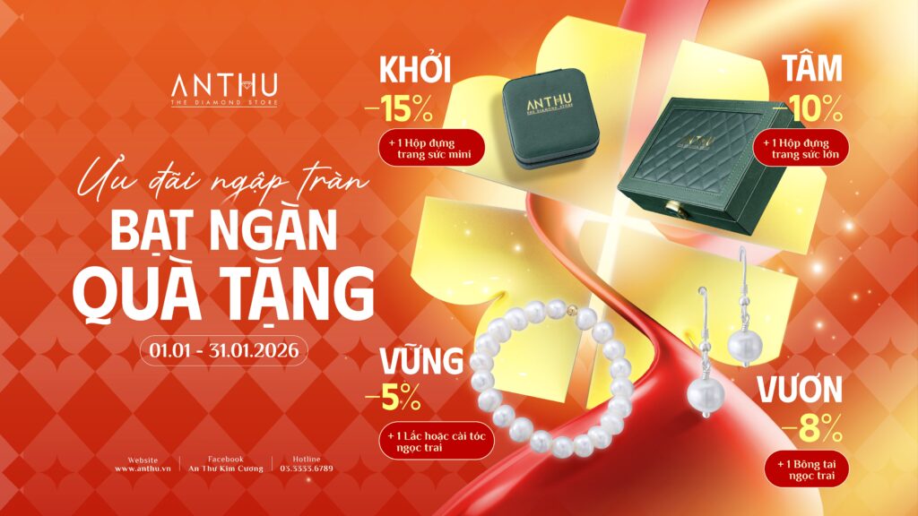 Mỗi đơn hàng đều được áp dụng mức ưu đãi và một phần quà tương ứng khi phát sinh giao dịch với An Thư Kim Cương. Ngoài ra, Quý khách hàng sẽ nhận thêm 02 xấp bao lì xì Tết siêu xinh cho đơn hàng đầu tiên phát sinh trong tháng 01.2026.